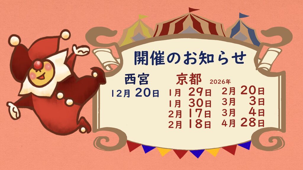 暑い暑い夏の後はあっという間に寒くなるここ数年ですが、しっかり秋を感じて楽しみたいですね! てづくりサーカスの2025年最後の月、12月の開催日が決定いたしました こうなると本当に一年があっという間に感じてしまいます … 続きを読む ☆てづくりサーカスin西宮神社12月の開催日のご案内☆