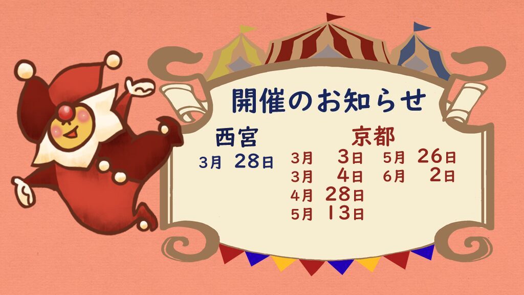 2026年は「平日でもたくさんのお客さんに出会える場所」 をテーマに色々な場所にアプローチをしている運営事務局です。 平安神宮前に続き 念願の駅近&室内の場所をお借りする事ができたので募集を開始いたします♪ … 続きを読む てづくりサーカスin河原町地下街