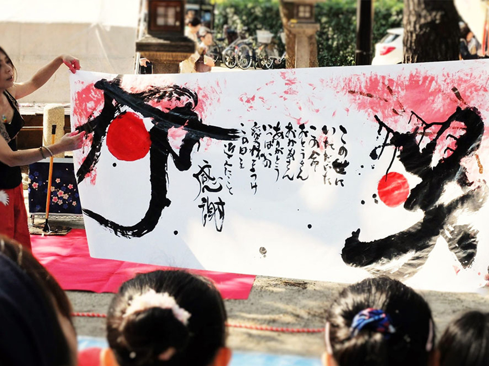 音楽に合わせて軽快に手拍子が鳴り響く中行われた即興書道アート。